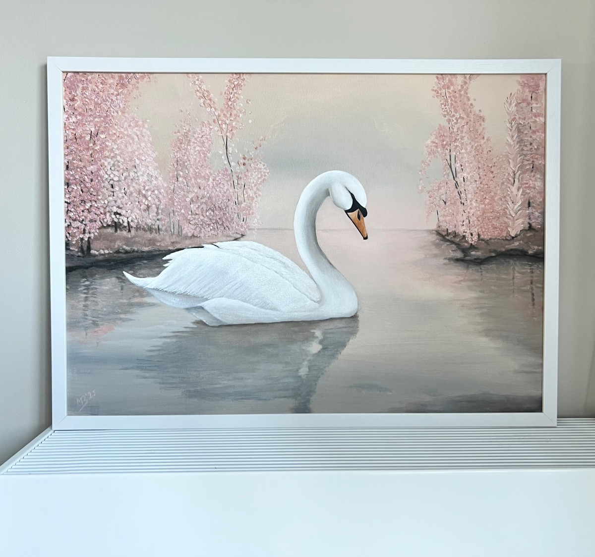 In het zachte licht van de dag glijdt de zwaan door het water. Omringd door bloesems in tedere tinten weerspiegelt zij alle zachtheid, rust en vertrouwen.