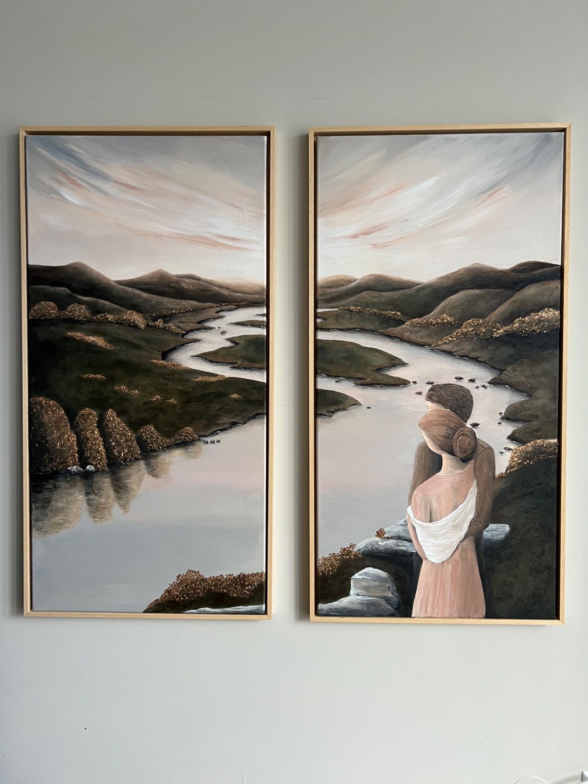 Een 2 luik gemaakt in opdracht. Geschilderd op canvasdoeken van het formaat 50x100. Het medium is acrylverf met een zijdeglans vernis. De baklijsten zijn gemaakt van Ayoushout.